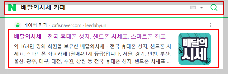 네이버에서 배달의 시세 검색 후
